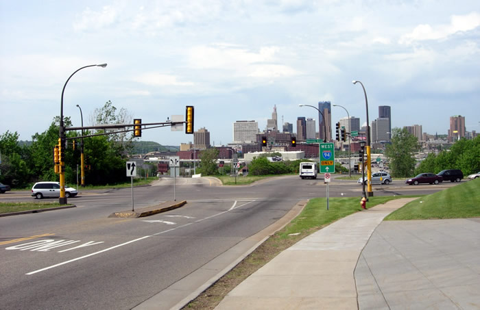 Looking southwest across Mounds Boulevard from 6th Street towards downtown.