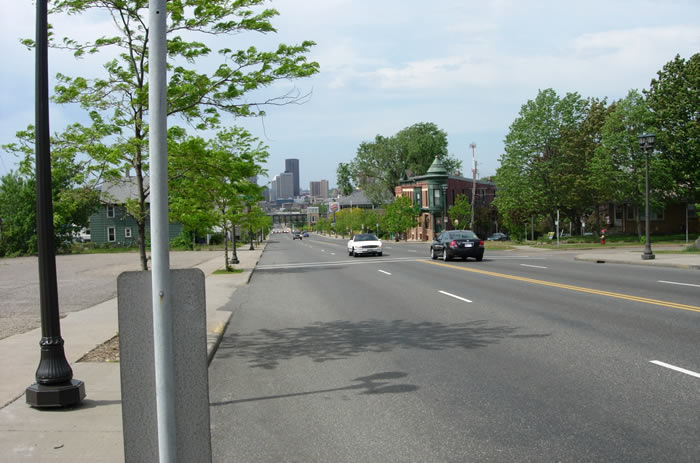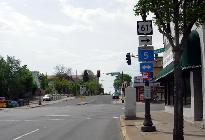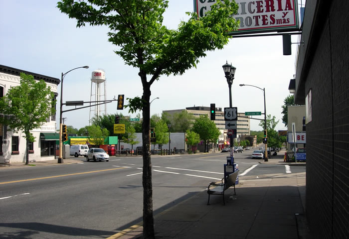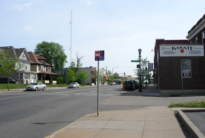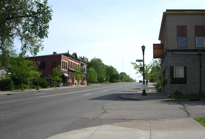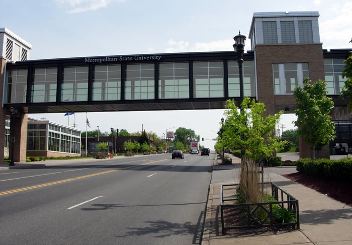 Looking east on 7th Street from Mounds Boulevard. Note the Metro State University